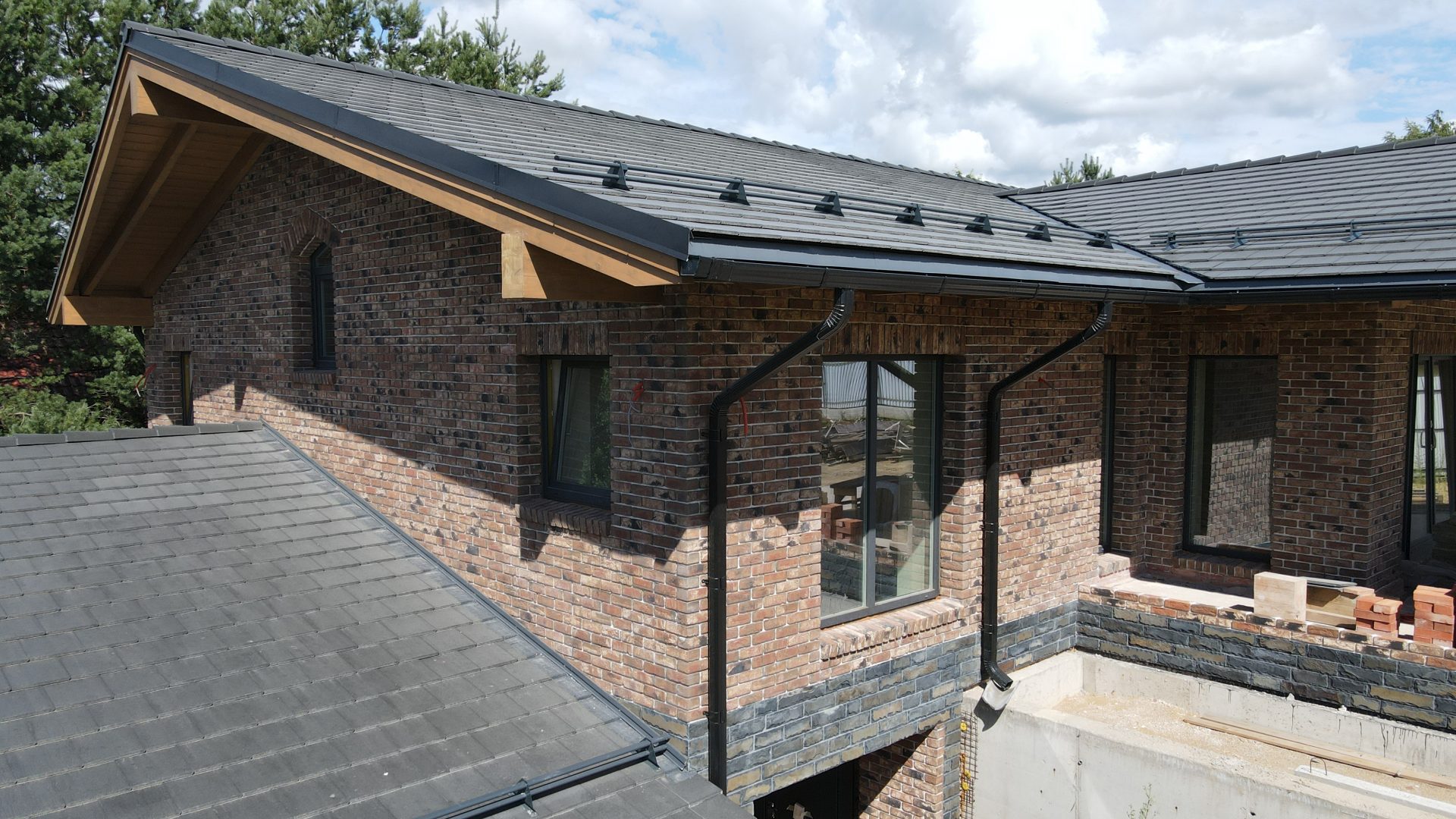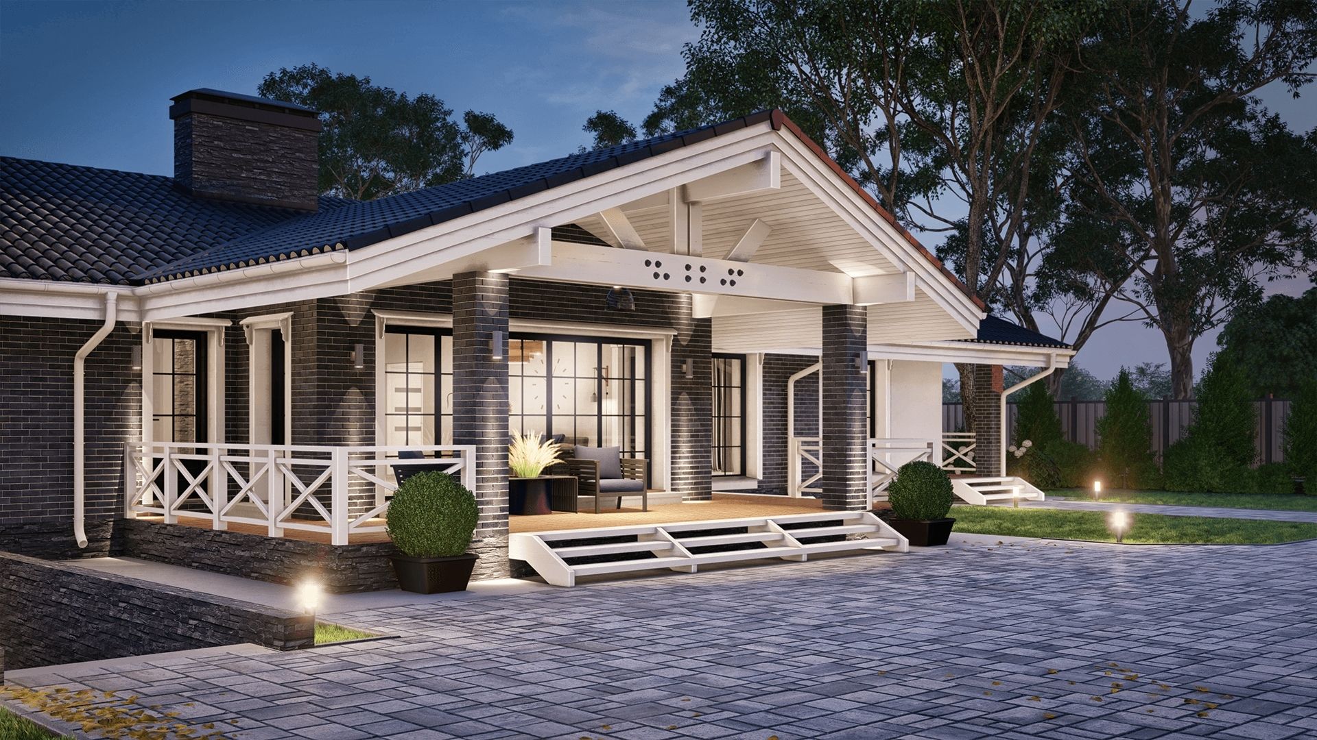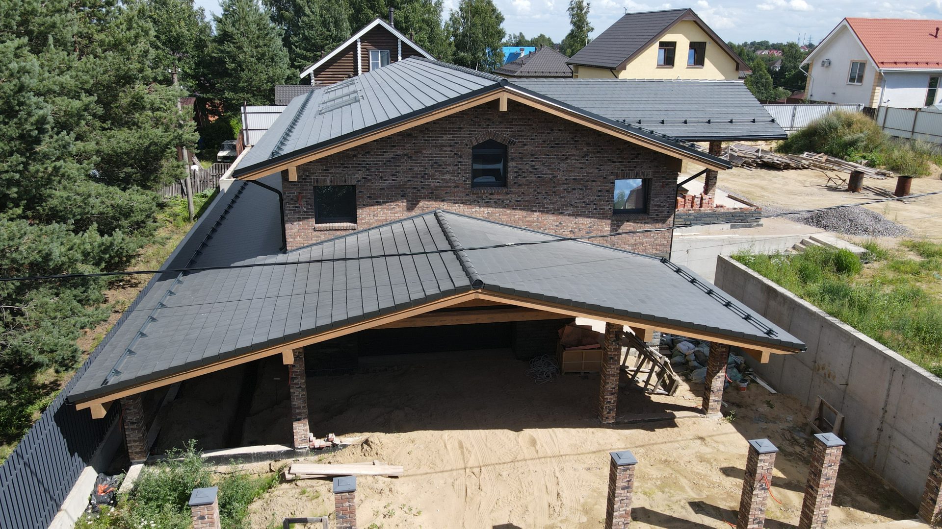 Привлекает внимание роскошная двускатная крыша с широкими свесами и окнами, выполненная из натуральной черепицы. Чувствуется исключительный стиль благодаря