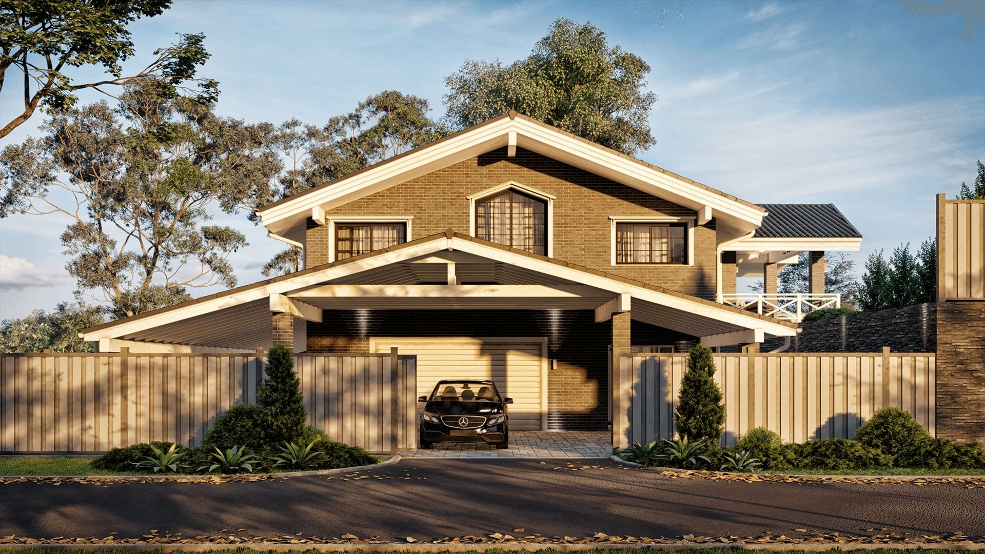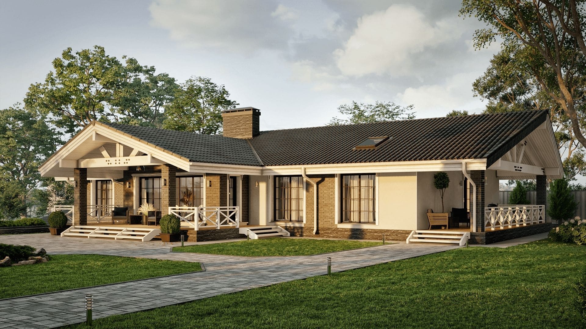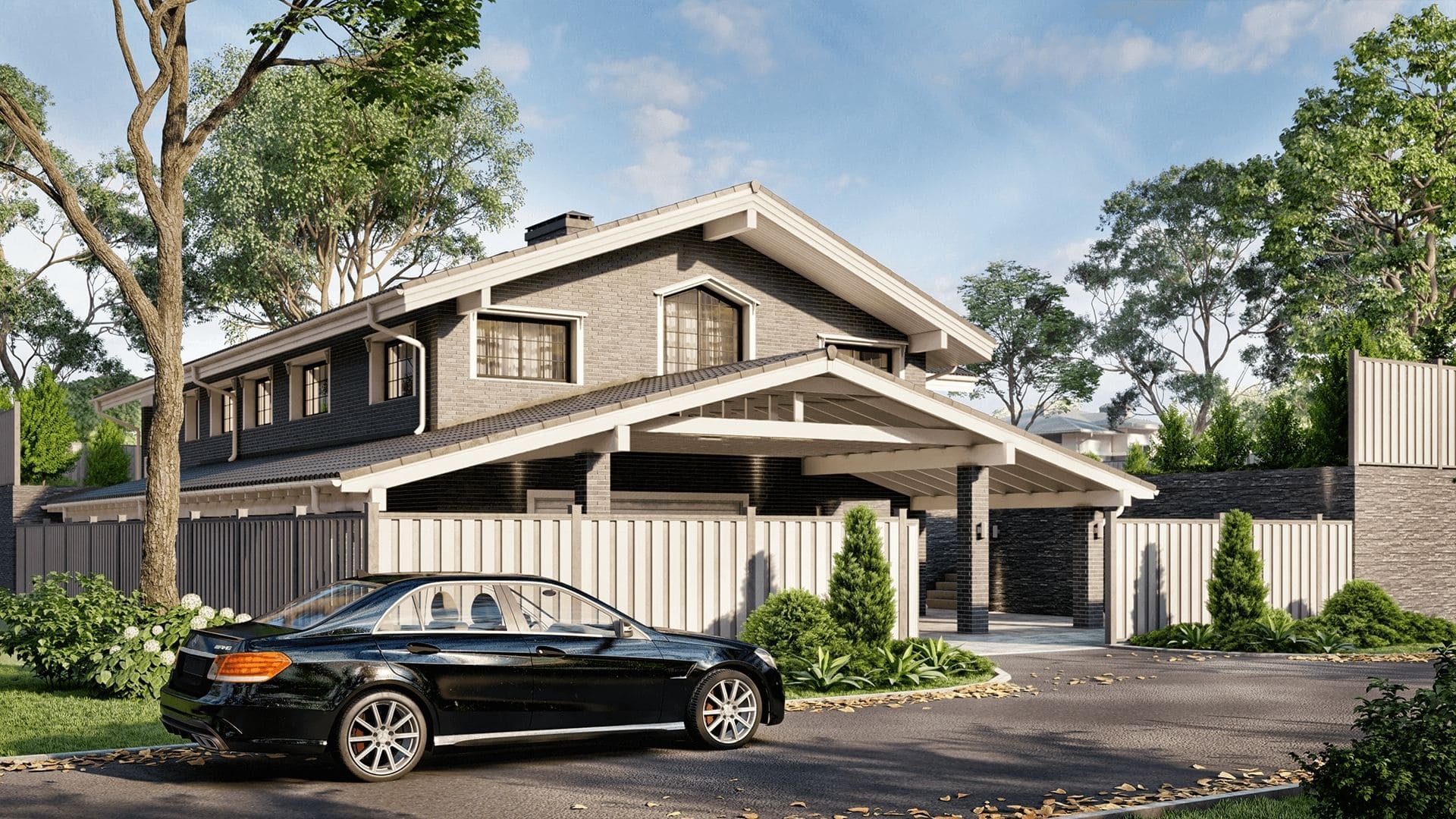 Двухэтажный загородный дом в стиле Шале с просторным двухместным этажом и тремя открытыми террасами под навесом.