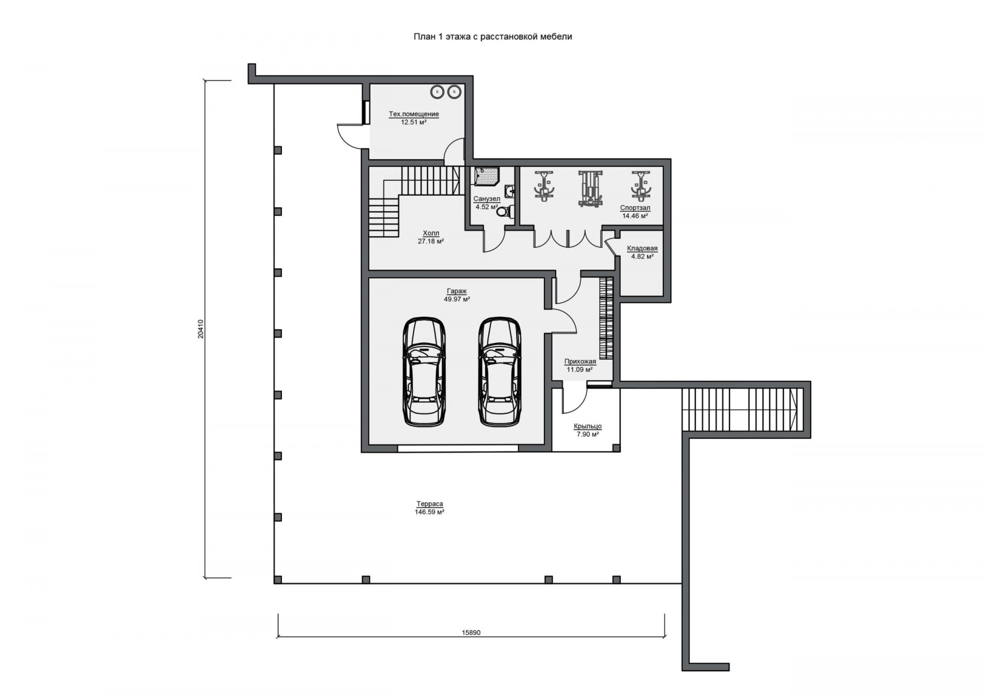 Цокольный этаж спроектирован с большим двухместных паркингом, спортзалом, просторным холлом