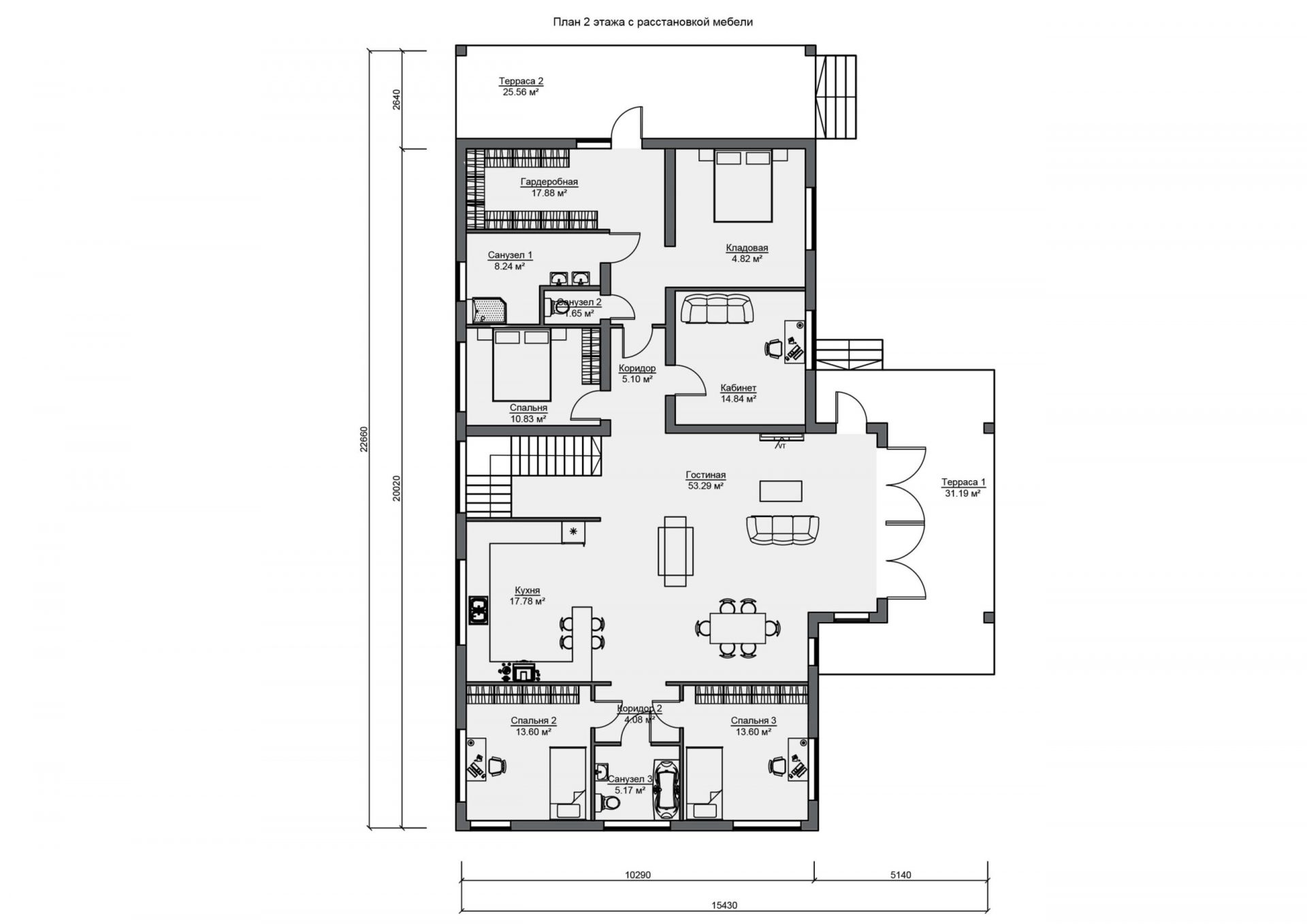 На втором этаже при входе с зоны второй террасы спроектирована гардеробная для комфортного хранения