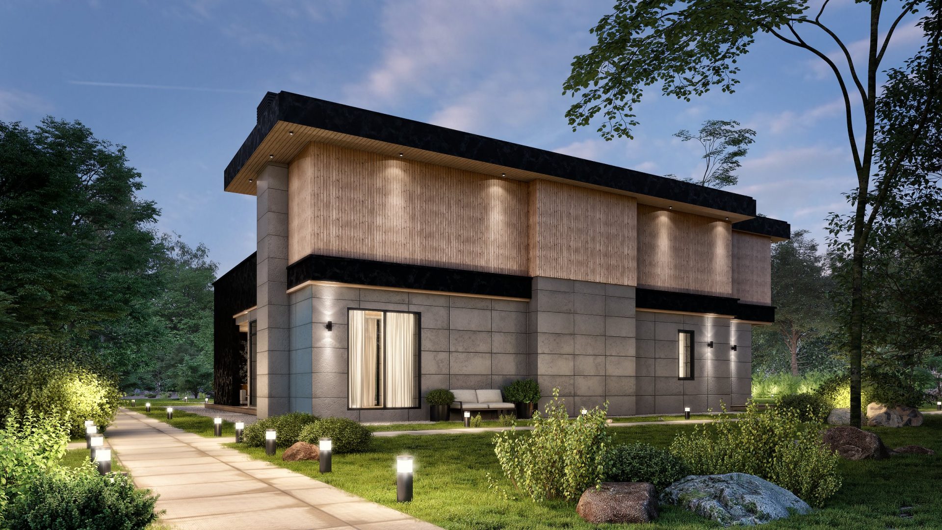 Сочетание дерева и камня. Проект грациозно вписывается в окружающий ландшафт и гармонично продолжает его.