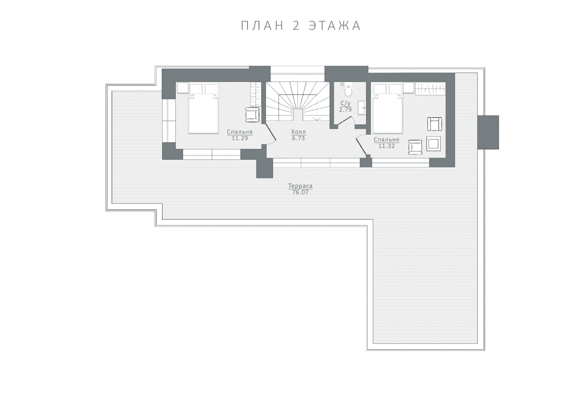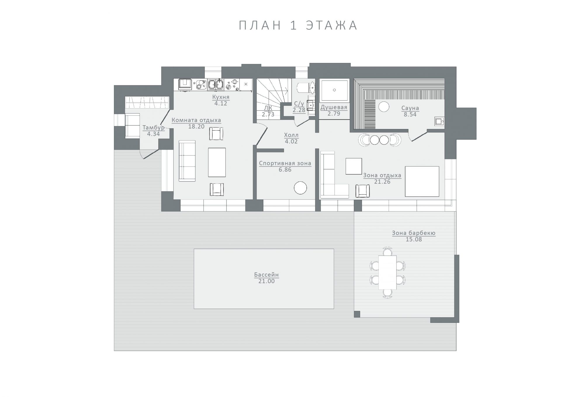 Рядом расположена зона отдыха и комфортная душевая. На этаже также размещена спортивная зона с выходом на открытую террасу.