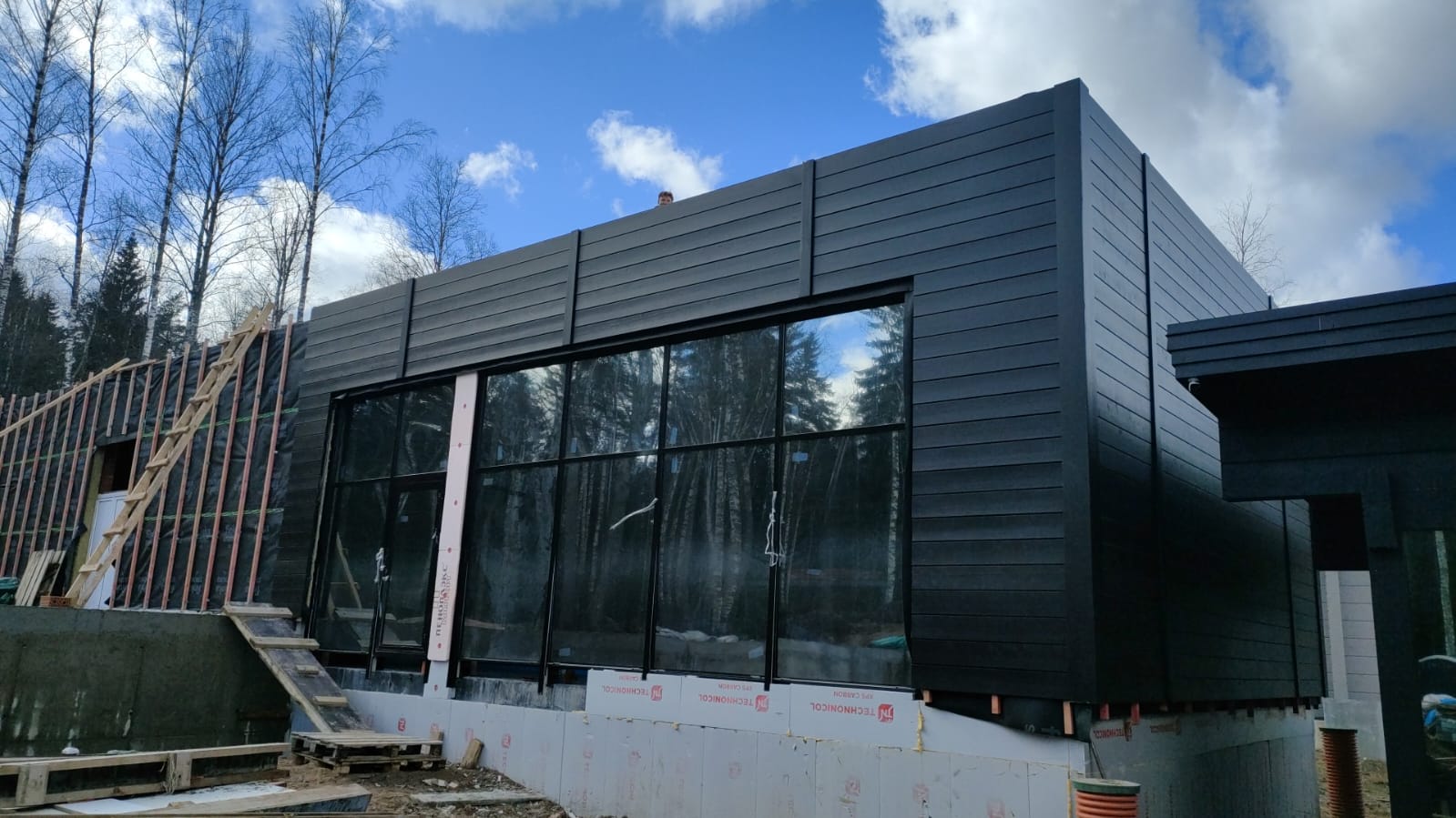 Ярко выделяются современные элементы стиля Хай-Тек - плоская кровля, роскошные панорамные окна, правильные